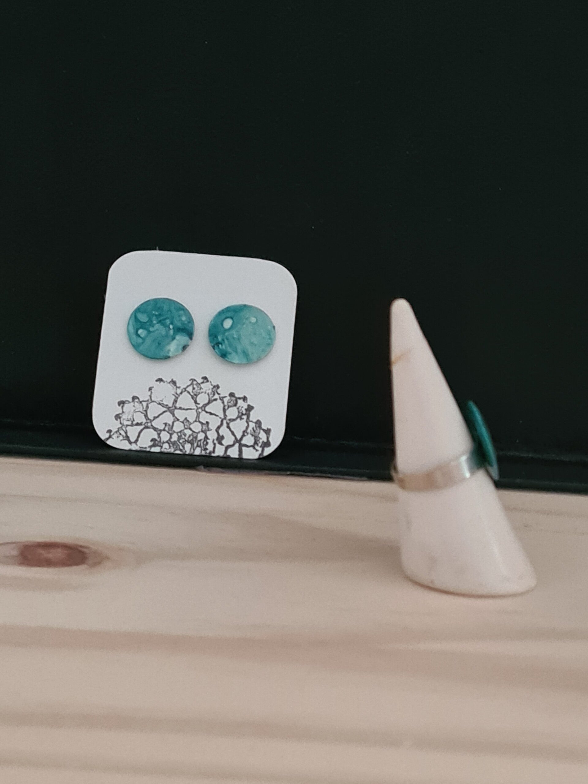 Deze handgemaakte set bestaat uit subtiele ronde oorstekers en een bijpassende verstelbare ring – perfect voor wie houdt van een natuurlijke, serene uitstraling met een vleugje zomerse elegantie.